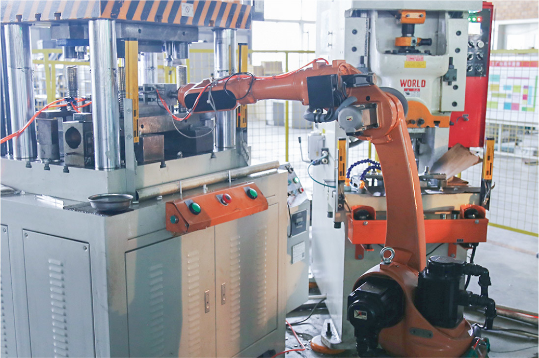 1号工位:机器人从料仓取料,依次对工件进行挤压成型、整型、切边、精挤加工,然后放入中转工位,供2号机器人取料。
